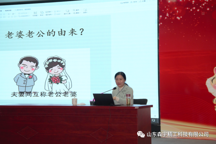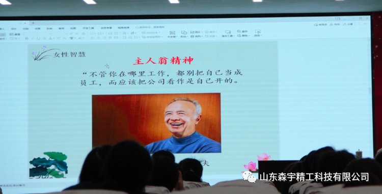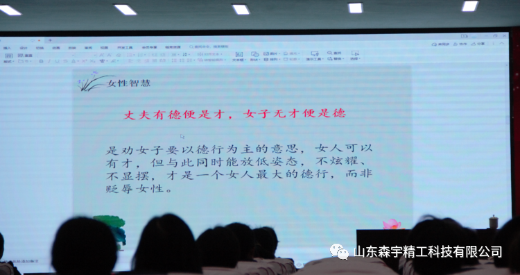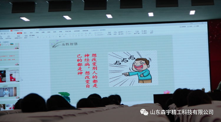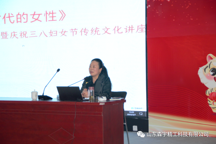 2022年3月7日,山東森宇精工科技有限公司在新辦公樓多動能廳舉辦了《智能時代的女性》傳統(tǒng)文化講座活動。慶?!叭恕眹H婦女節(jié),傳承中華文化,弘揚傳統(tǒng)美德,營造文明祥和的社會氛圍。
